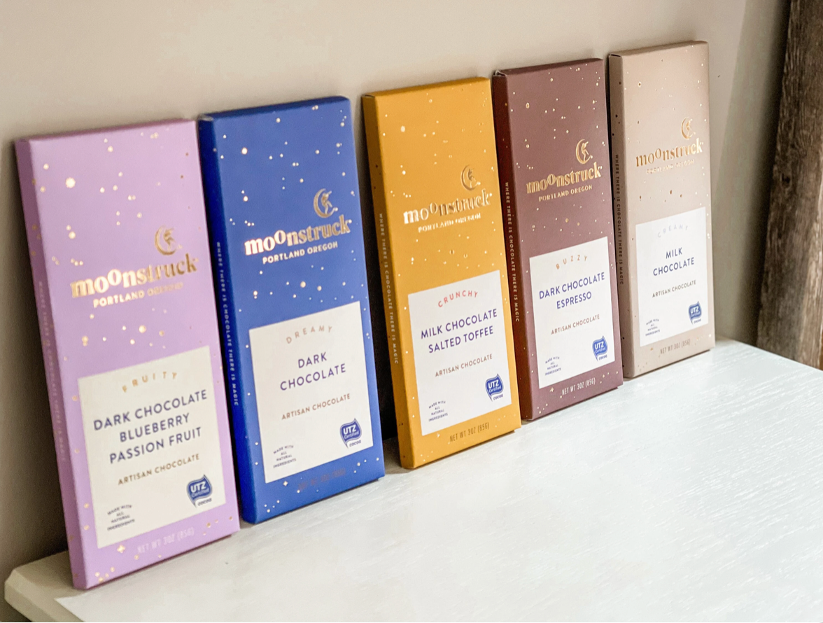 DARK CHOCOLATE, TOASTY SESAME CARAMEL CHOCOLATE, MILK CHOCOLATE SALTED TOFFEE, MILK CHOCOLATE, DARK CHOCOLATE BLUEBERRY PASSIONFRUIT, MINT CHOCOLATE.