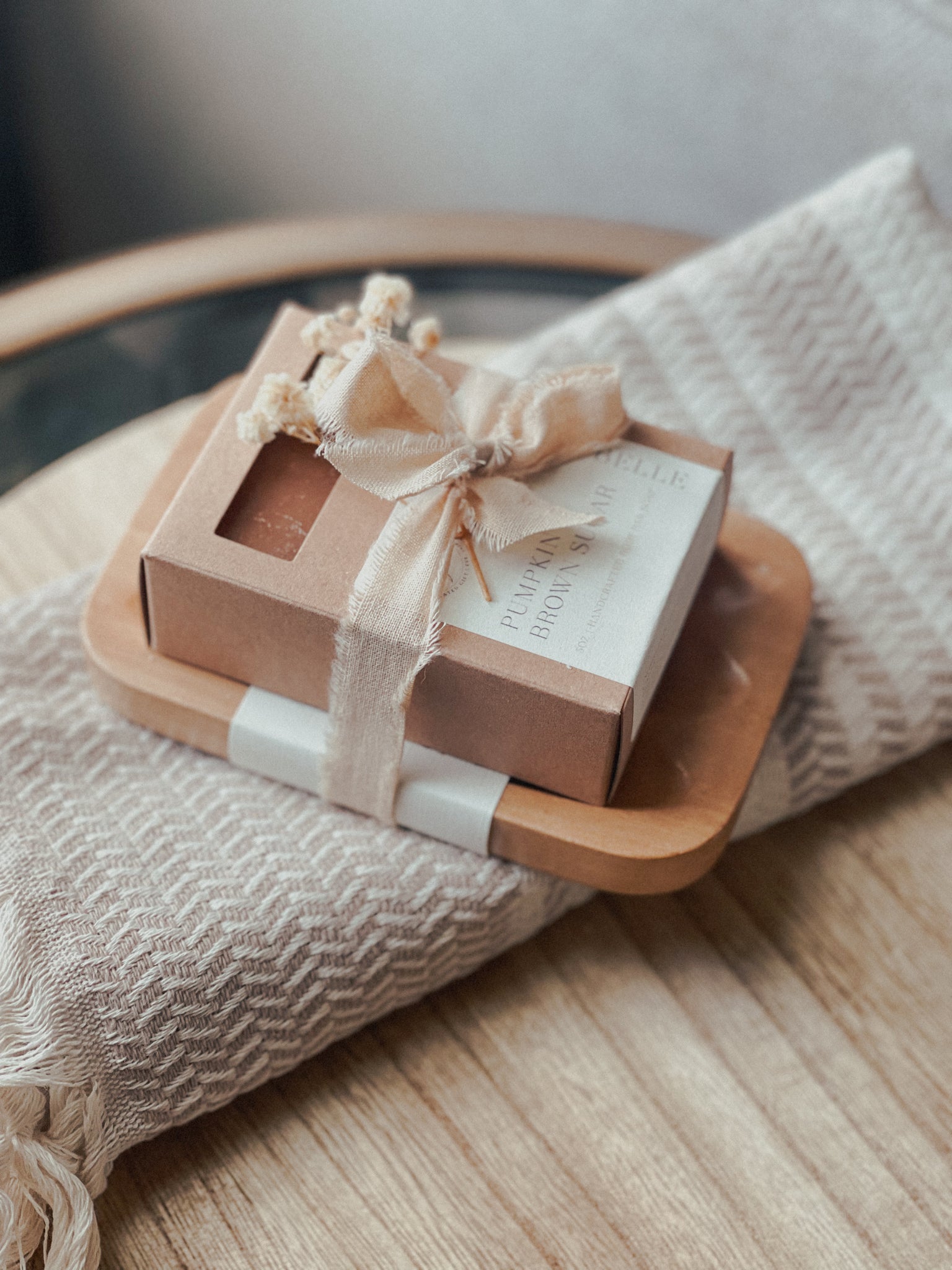 Each 5oz Handcrafted Artisan Soap Comes in Kraft Box with label ready to gift, made with all natural and organic ingredients! Wooden Soap Dish and Soap will come ready to gift with cotton ribbon and a sprig of flower.